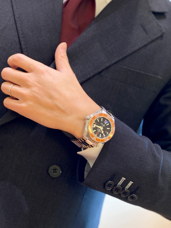 新作には、ブラックベゼル、ブルーベゼルのバリエーションもある中、プラネットオーシャンらしさをより感じていただけるのはエネルギッシュなオレンジベゼルモデルです。
