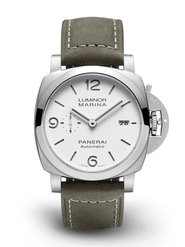 ホワイトの上品なダイアルに、ヴィンテージな雰囲気を感じさせるレザーストラップが魅力的なルミノール マリーナ。