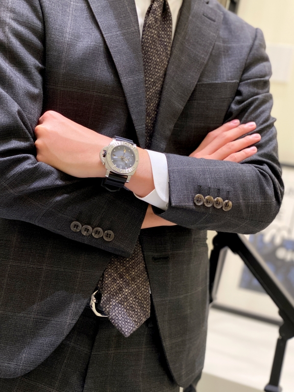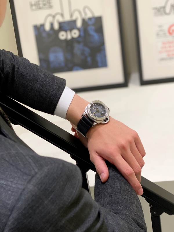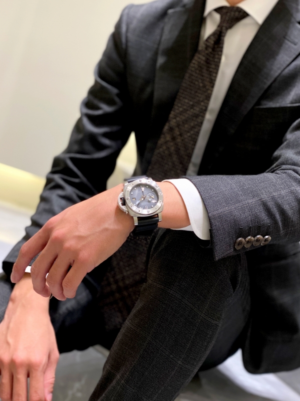 ケース径は44ミリと存在感あるサイズ感。パネライ特有のクッションケースのおかげで、腕馴染みが良く、ビジネススタイルに合わせても面白いです。