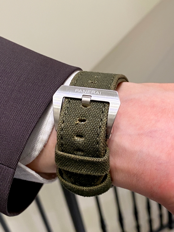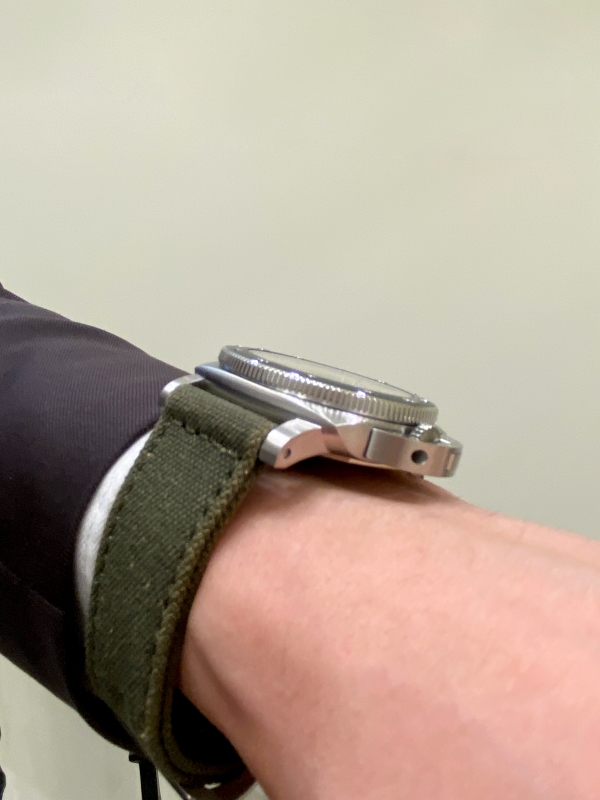 このモデルの個性を決定づけている、このダークグリーンのファブリックベルトです。