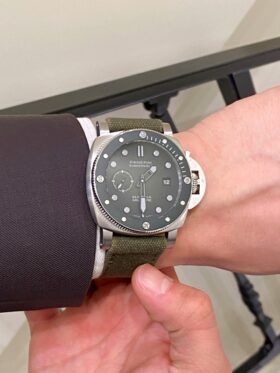 品名:サブマーシブル マリーナ ミリターレ/品番:PAM01697/素材:サテンスティール/自動巻きメカニカル/サイズ:44mm/ストラップ:ダークグリーン テキスタイル、STD、24/22/税込価格:1,848,000円(2026年2月)