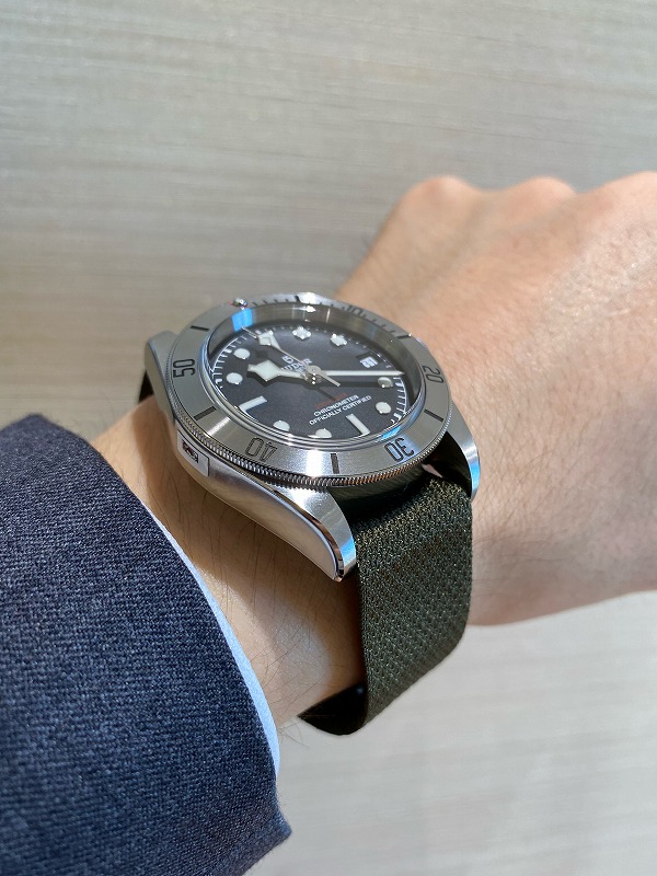 今回ご紹介しているのは、ファブリックストラップのモデルになります。サテンブラッシュド仕上げのスチール製のケースに、カーキのストラップは相性が良いです。