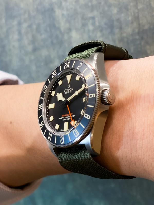 鮮やかなオレンジ色のGMT針が目を惹き、グリーンの細かい糸を大量に編み込み耐久性と滑らかな着け心地のファブリックストラップが相性抜群です。